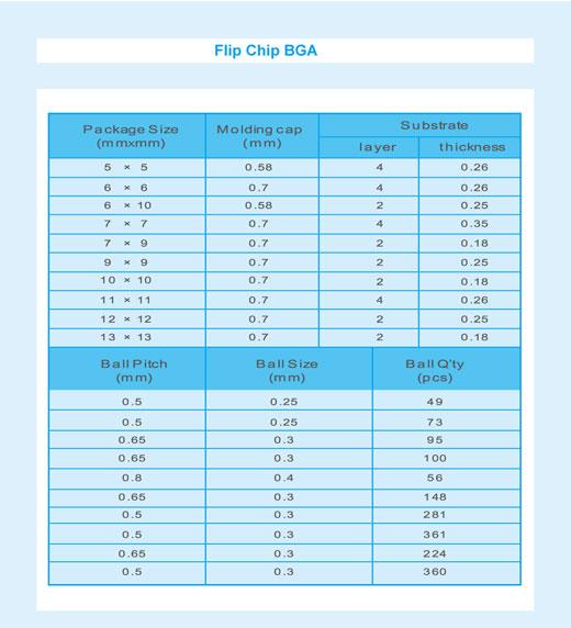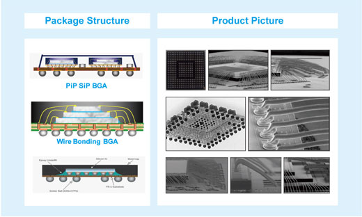 關(guān)鍵技術(shù): 高密度、低弧高(40um)、窄間距(50um)打線,Spacer技術(shù),倒裝芯片技術(shù)(突塊高度70um/80um/100um),芯片堆疊,密間距植球技術(shù)(球徑250um,球間距400um)。
